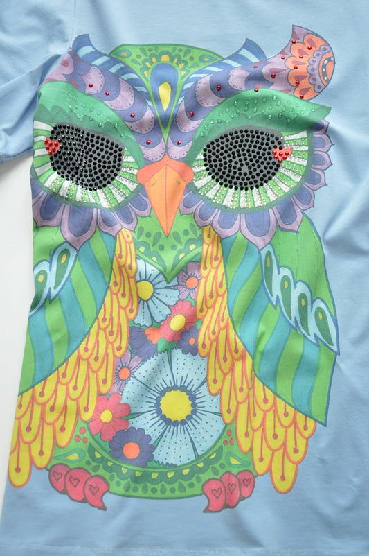 Crystal embellished Owl graphic-print blue cotton T-shirt