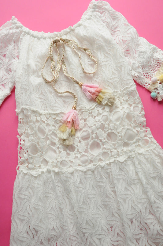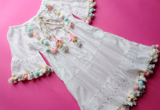 White straight-cut t-shirt with broiderie anglaise frilled sleeves