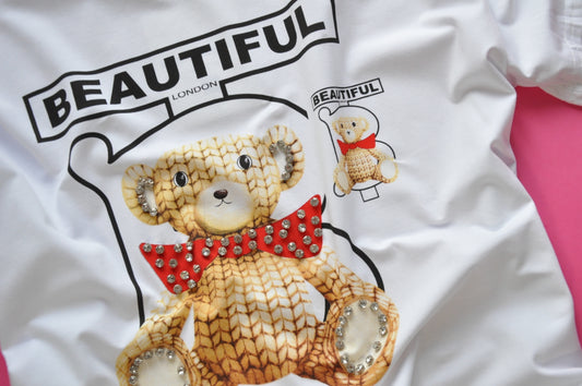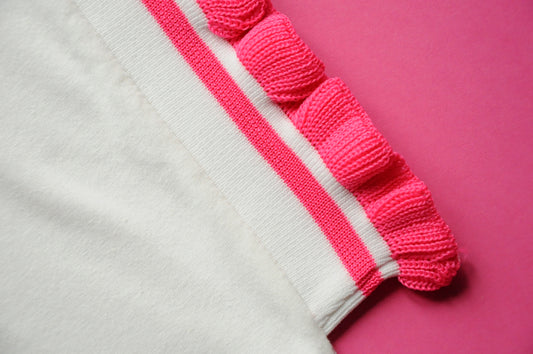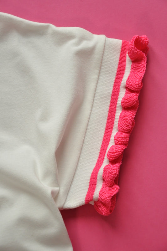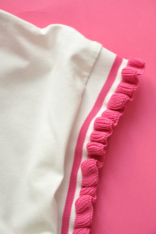 Cream soft cotton tee with extreme knit frill pink sleeves