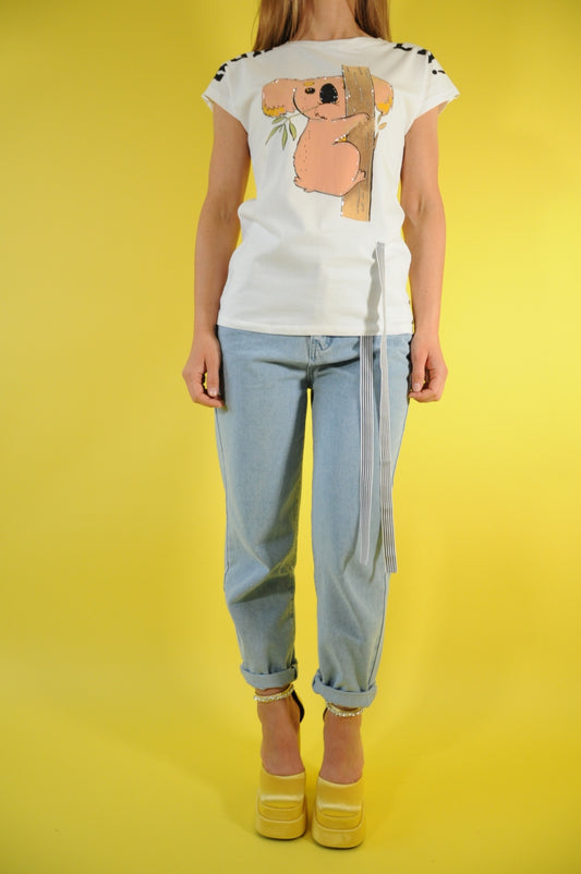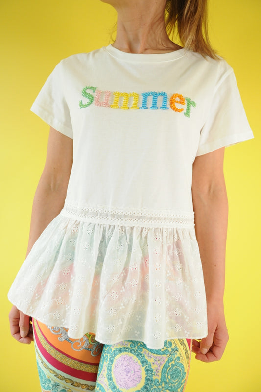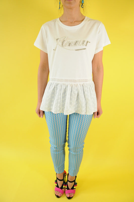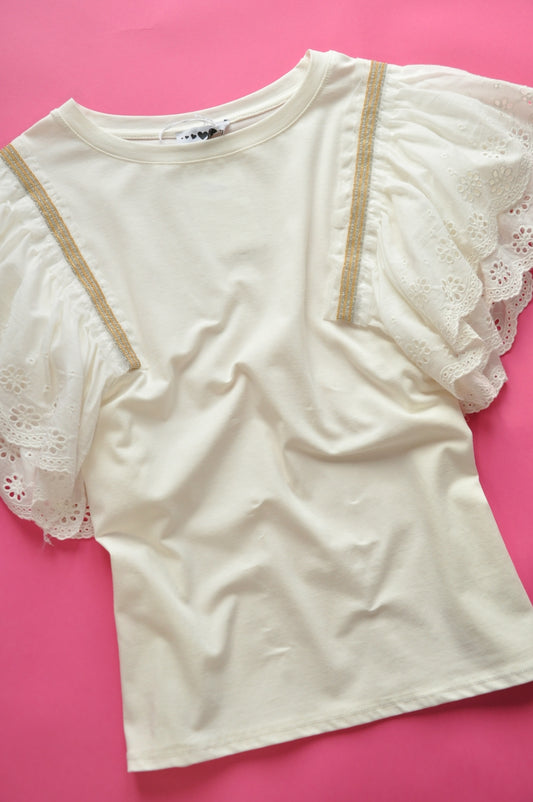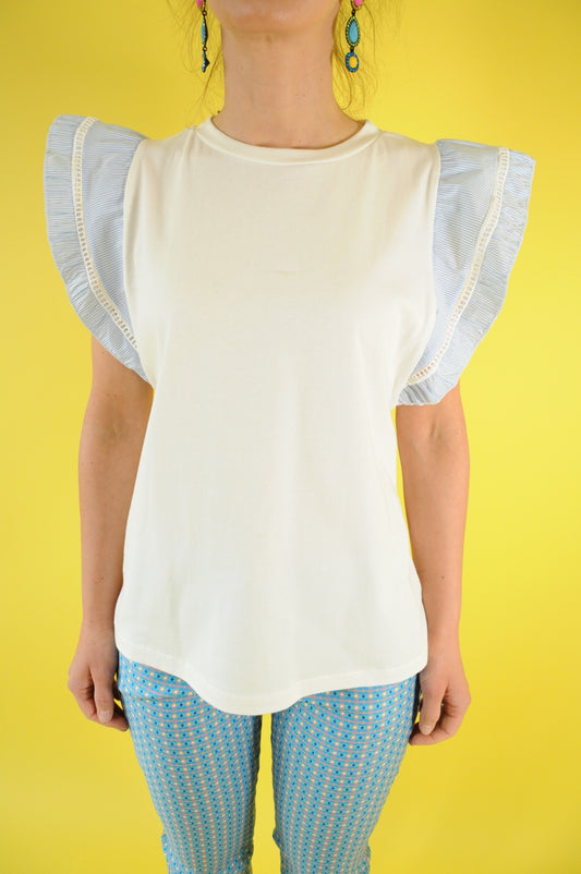 White straight-cut t-shirt with broiderie anglaise frilled sleeves