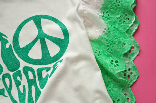 White straight-cut t-shirt with brocade green heart detail and frilled sleeves