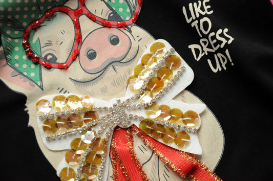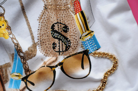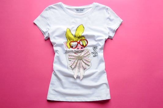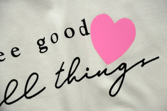 Ecru staright-cut t-shirt with pink PVC heart crochet and frills