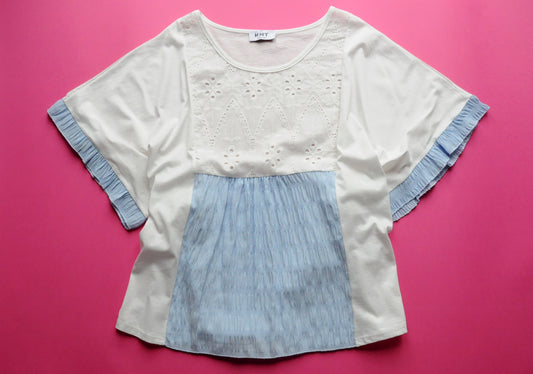 White oversized t-shirt with elasticated blue check and frilled batwing sleeves