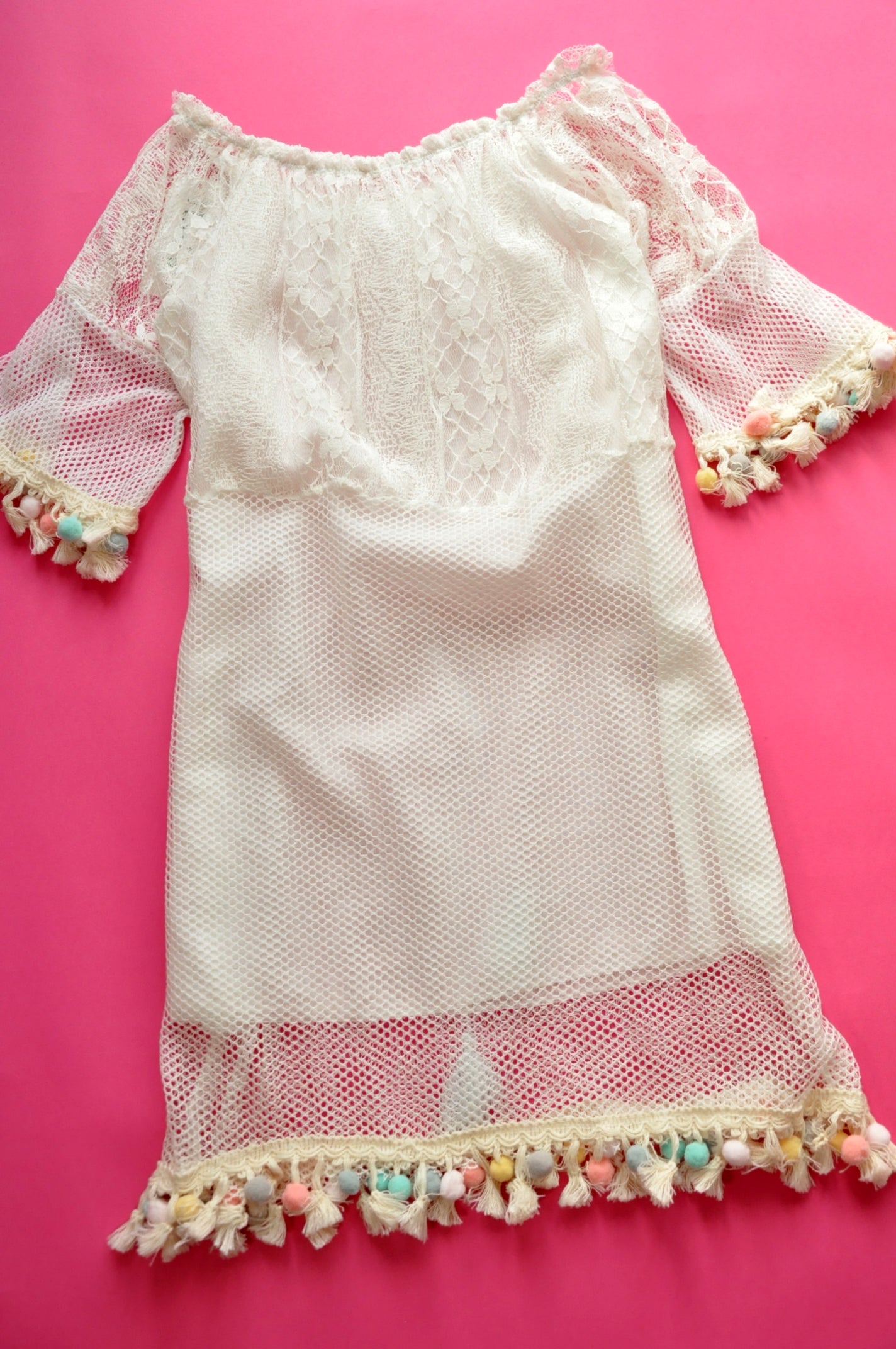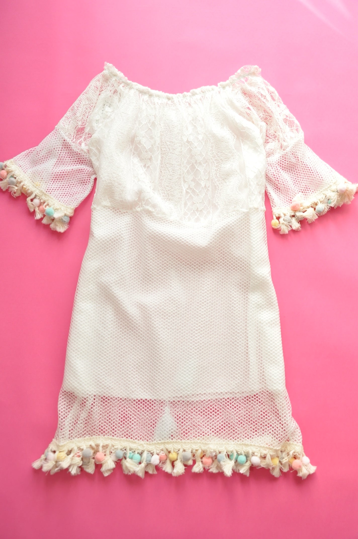 Ecru lace and mesh holiday tassel dress